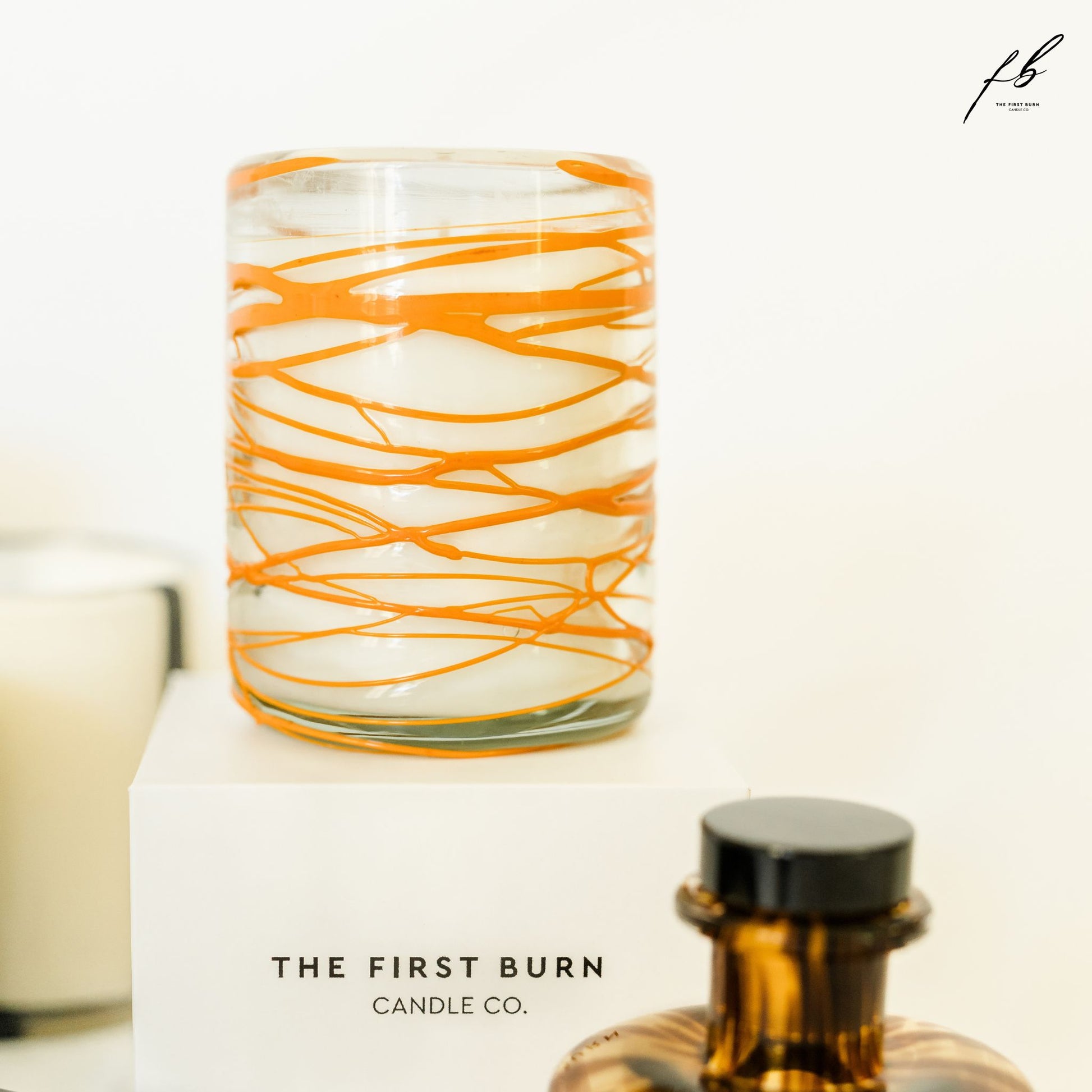 Each candle is hand-poured into our Orange Swirl candle vessel--one of our most unique, handblown glass vessels from Mexico—designed to double as a stylish cocktail glass perfect for fall. Available while supplies last.